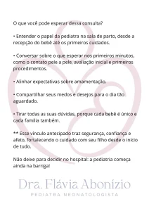 • Consulta pré-natal pediátrico (informações sobre amamentação, rotina de sala de parto e triagem neonatal)