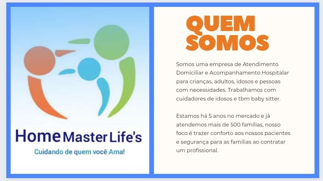 A empresa Home Master Life’s é especializada em prestar atendimento no conforto da sua residência e/ou acompanhamento hospitalar a idosos, adultos e pessoas com necessidades especiais. Nossos profissionais são qualificados, supervisionados constantemente por enfermeiros e comprometidos com o trabalho; periodicamente participam de cursos de aperfeiçoamento profissional; proporcionando segurança e cuidado adequado as famílias.