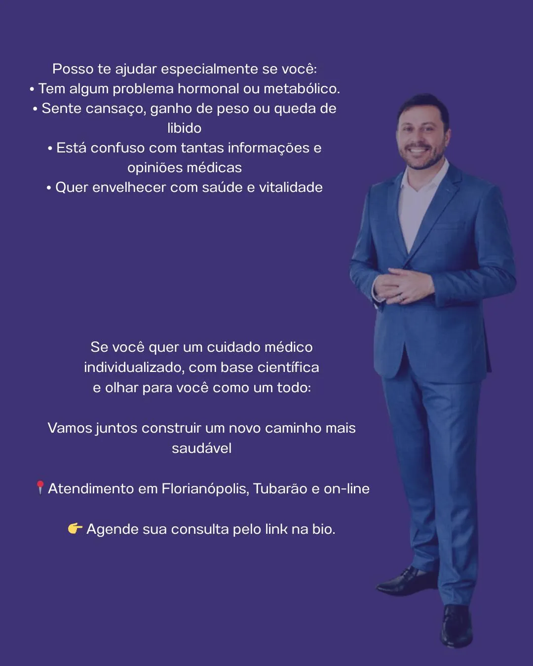 Médico Endocrinologista formado pelo Hospital das Clínicas da USP, ex-professor da disciplina de Endocrinologia da Faculdade de Medicina Unisul/SC e com 20 anos de experiência em consultório, atendendo pacientes com diabetes, obesidade, doenças na tireoide e outros tratamentos hormonais em Florianópolis e Tubarão Currículo Estudar sempre foi minha vocação, entrando no Curso de Medicina da Universidade Federal de Santa Catarina aos 17 anos de idade. Conclui a graduação com honra ao mérito em 1996 por ter obtido o melhor índice de aproveitamento durante todo o curso. Eu continuei meus estudos em São Paulo onde cursei Medicina Interna e Endocrinologia e Metabologia no Hospital da Clínicas da Universidade de São Paulo (1997-2000). Fiz estágio no Institut Gustav Roassy em Paris/ França, um centro de excelência em câncer de tireoide de onde saí para assumir a Disciplina de Endocrinologia da Faculdade de Medicina Unisul/SC. Desde então, concilio a atividade docente com o consultório médico, mantendo-me atualizado em cursos e congressos tentando unir o conhecimento científico com a humanização no atendimento.